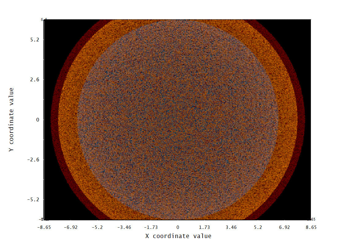 After setting the system up for analysis, a ray trace was conducted (Figure 4). In our simulation, we let the rays split, and saved the results to a ray database (ZRD) file in order to make analysis faster for this particular run. Please note that these files are relatively large, so the compressed version of the complete data is often a good compromise between data density and used storage space. When the ray trace finishes, you can observe the irradiance at the detector plane. The ray trace allows the use of the detector viewer, which will permit different views of the irradiance. A false color view of the irradiance is shown in Figure 5. A linear scale was chosen for the analysis, but log scales are also available. As Figure 5 shows, the issue with the annular drop in irradiance was corrected. This design was chosen for manufacturing.