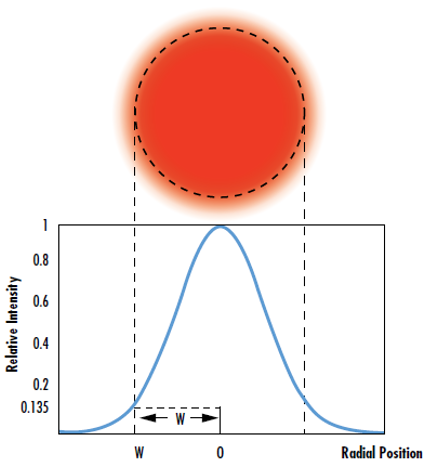 Figure 1: The waist of a Gaussian beam is defined as the location where the irradiance is 1/e2 (13.5%) of its maximum value