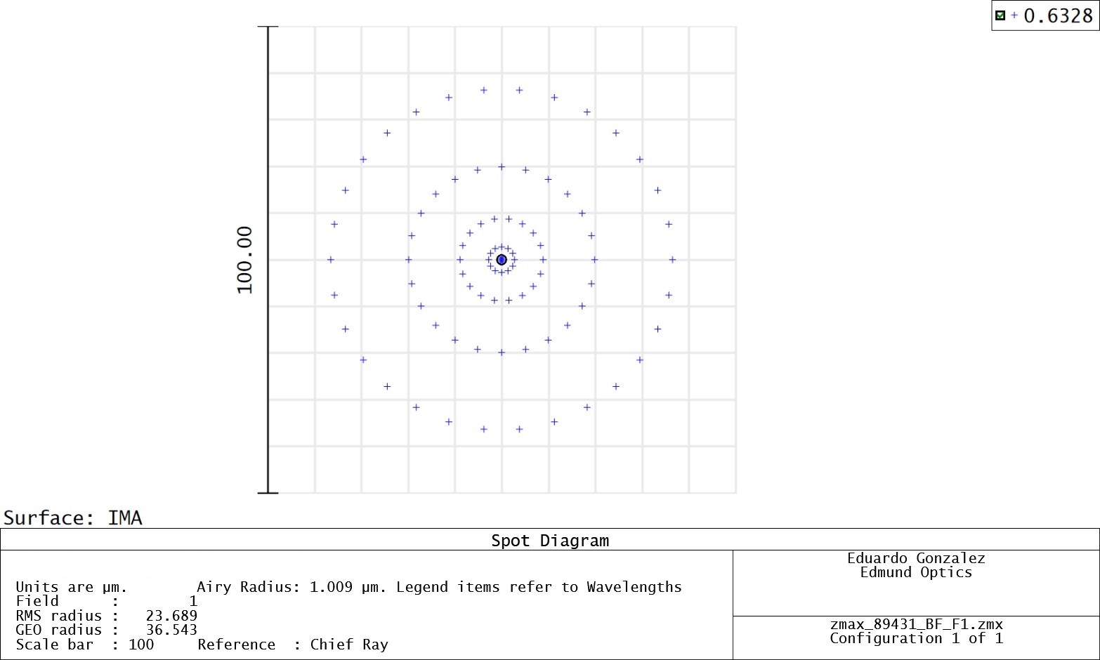 While prime lenses require more time and involvement to design, their advantages over best form lenses are often well worth it. Best form lenses often struggle with spherochromatism and narrow field, as previously mentioned. Figure 4 and Figure 5 show spot size comparisons between both design approaches. Prime design allows for the mitigation of these difficulties. The orientation of prime aspheres allows for smaller spot sizes due to the refracting power being split between two surfaces instead of one. Additionally, this orientation causes prime aspheres to be less sensitive to changes in light wavelength. Finally, prime aspheres are better at handling off-axis rays and misalignment in systems. Off-axis performance is better suited to these lenses than best form designs. However, for all the advantages of prime aspheric lenses, they do have their disadvantages. When their orientation is flipped, performance will deteriorate, and total internal reflection may occur. Thankfully, this is easily avoided by being familiar with the intended design of prime aspheres and recognizing their correct orientation.