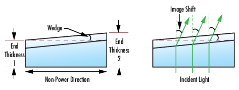 In an ideal cylinder, the planar side of the lens is parallel to the cylinder axis. Angular deviation between the planar side of the lens and the cylinder axis is known as the wedge, which is typically measured in arcmin (Figure 2). This angle is determined by measuring the two end thicknesses of the lens and calculating the angle between them. Wedge leads to an image shift in the non-power direction, just like wedge in a window.