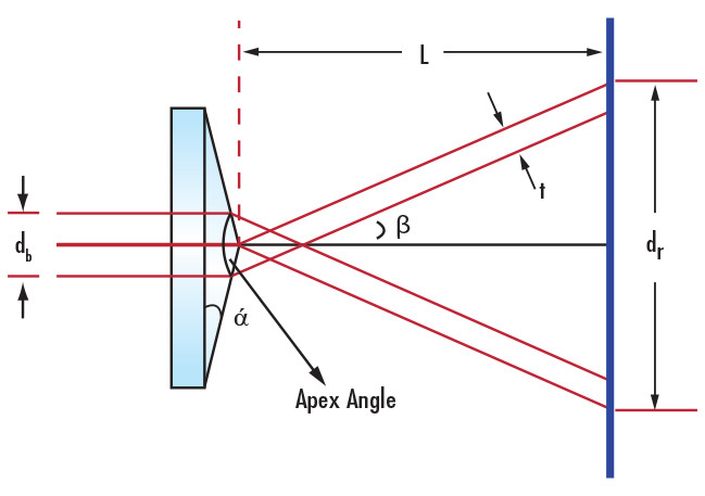 Axicons are conical prisms that are defined by the alpha and apex angle. As the distance from the Axicon to the image increases, the diameter of the ring increases, while the line thickness remains constant.
